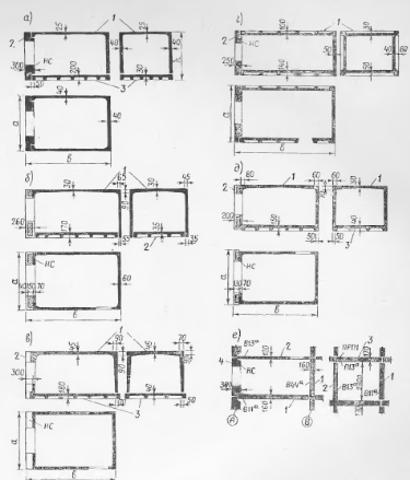 назначать соответствующую толщину или сечения стен, потолков, несущих углов, перекрытий. С учетом требований звукоизоляции и технологичности наименьшую толщину сечений граней блоков следует принимать 5—6 см из тяжелого бетона и 7—8 см из легкого бетона;