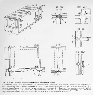 На рис. 1 представлены конструкции объемных блоков для различных технических направлений. По конструктивно-технологическому признаку их можно свести к двум типам: «колпак» с опиранием по углам и по контуру и «лежащий стакан». Конструкции типа «колпак» различаются также способом присоединения к панели перекрытия: путем стирания на нее или подвешивания ее к стенам внутри блока.