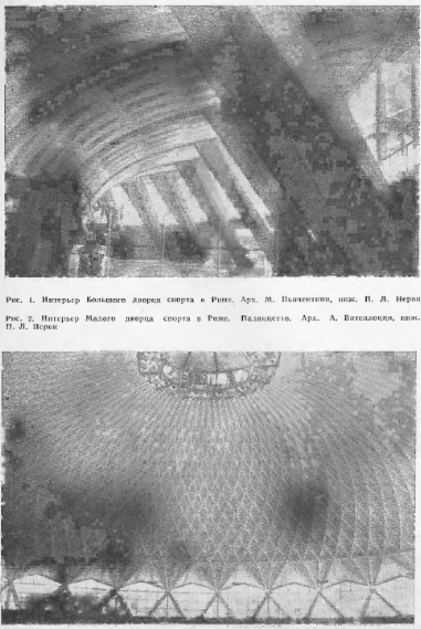 Во всех этих сооружениях неловто римый художественный эффект дает артистичная, разработанная с учетом архитектурной тектоники прорисовка конструкций: в интерьерах Палаццетто — это изменение масштаба кессонов купола и группировка ребер кессонов у наклонных опор, в фасадной композиции этого же сооружения — ритмичный шаг наклонных опор, за которыми в глубокой тени спрятан ненесущий стеклянный витраж. Выразительность такой композиции особенно ярко проявляется в сопоставлении с фасадом Большого дворца спорта, где уникальные по тектонической выразительности наклонные опоры купола скрыты безразличным стеклянным цилиндром витража (рис. 1 и 2). iB здании пленарных заседаний ЮНЕСКО исключительно интересной и выразительной оказалась архитектурная трактовка складчатой конструкции (рис. 3).