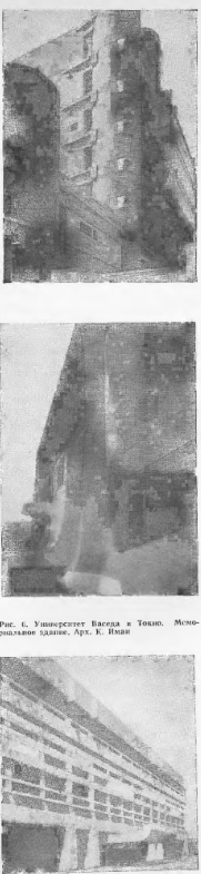 Не менее известны здания нью-йоркского аэровокзала с покрытием из четырех железобетонных оболочек неправильной формы, напоминающем взлетающую птицу (арх. 3. Сааринен), или кашелла в Роншан (арх. Ле Корбюзье). К этому направлению можно отнести и мемориальное здание на территории университета Васеда в Токио (рис. 6).