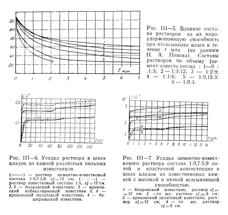 На рис. III—4 представлены данные, показывающие, что в кладках с различными абсорбционными свойствами усадка известкового раствора оказалась в 1,2—2,4 раза меньше, чем смешанного раствора. Аналогичные данные были получены В. А. Степаняном [122] при проведении опытов с кладками из туфов. Это явление вполне закономерно и объясняется повышенной водоудерживающей способностью известковых растворов (рис. III—5) и отсутствием в них цемента.