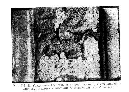 При выполнении кладок на литых растворах, характеризующихся повышенной начальной усадкой (рис. III—7), в ряде случаев отмечается появление в растворе усадочных трещин (рис. III—8). Эти случаи, как правило, относятся к кладкам из известняков с высокой всасывающей способностью. Предотвратить это нежелательное явление можно путем ограничения предельной консистенции раствора и предварительным увлажнением камня.