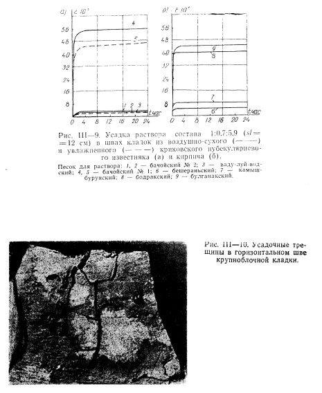 Величина усадки раствора возрастает по мере увеличения в используемом заполнителе мелких фракций и глинистых примесей. В Молдавии, например, имеется Бачойское промышленное месторождение очень мелкого песка, содержащего до 10% глины. Усадка раствора на этом песке до 20 раз превышает усадку раствора на песке нормальной крупности (рис. III—9, а). Не удивительно, что при обследовании каменных зданий, построенных на территории МССР с использованием для кладки раствора на бачойском песке, в растворных швах весьма часто фиксировались отчетливо видимые усадочные трещины. В тех случаях, когда использование раствора на бачонском песке совпадало с применением для кладки известняка со сравнительно высокой всасывающей способностью (например криковского нубекуляриевого), усадка раствора приводила к полному расслоению кладки по растворным швам. Особенно наглядно последствия чрезмерно большой усадки раствора можно наблюдать в кладках из крупных блоков (рис. III 10). Это объясняется тем, что в данном случае усадочные деформации развиваются по площади, в 5—10 раз превышающей опорную площадь мелкого блока.