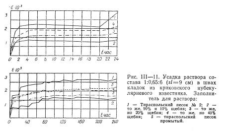 Обычно большая усадка растворов на мелкозернистых песках может быть существенно уменьшена введением в состав заполнителя небольшого количества мелких отходов камнедробления. В подтверждение на рис. III—11 приведены результаты наблюдений за усадкой раствора в швах кладок из криковского нубекуляриевого известняка. В качестве заполнителя для раствора в этих опытах использовался песок № 2 Тираспольского карьера и отходы камнедробления плотного микаутского известняка с размером фракции от 0,63 до 5,0 мм. Как видно из рис. III—11, замена 10% объема песка отходами камнедробления обеспечила двукратное снижение усадки раствора. Однако при более высокой дозировке отходов камнедробления в составе заполнителя, отмеченный эффект был менее заметен. Следует учитывать также и то, что с увеличением содержания в заполнителе отходов камнедробления сверх 10—15% удобоукладываемость раствора ощутимо снижается.
